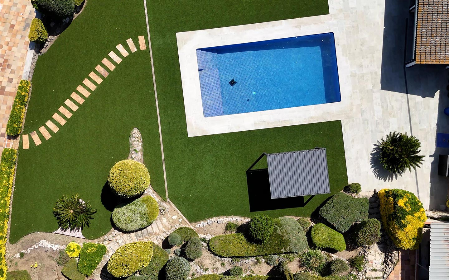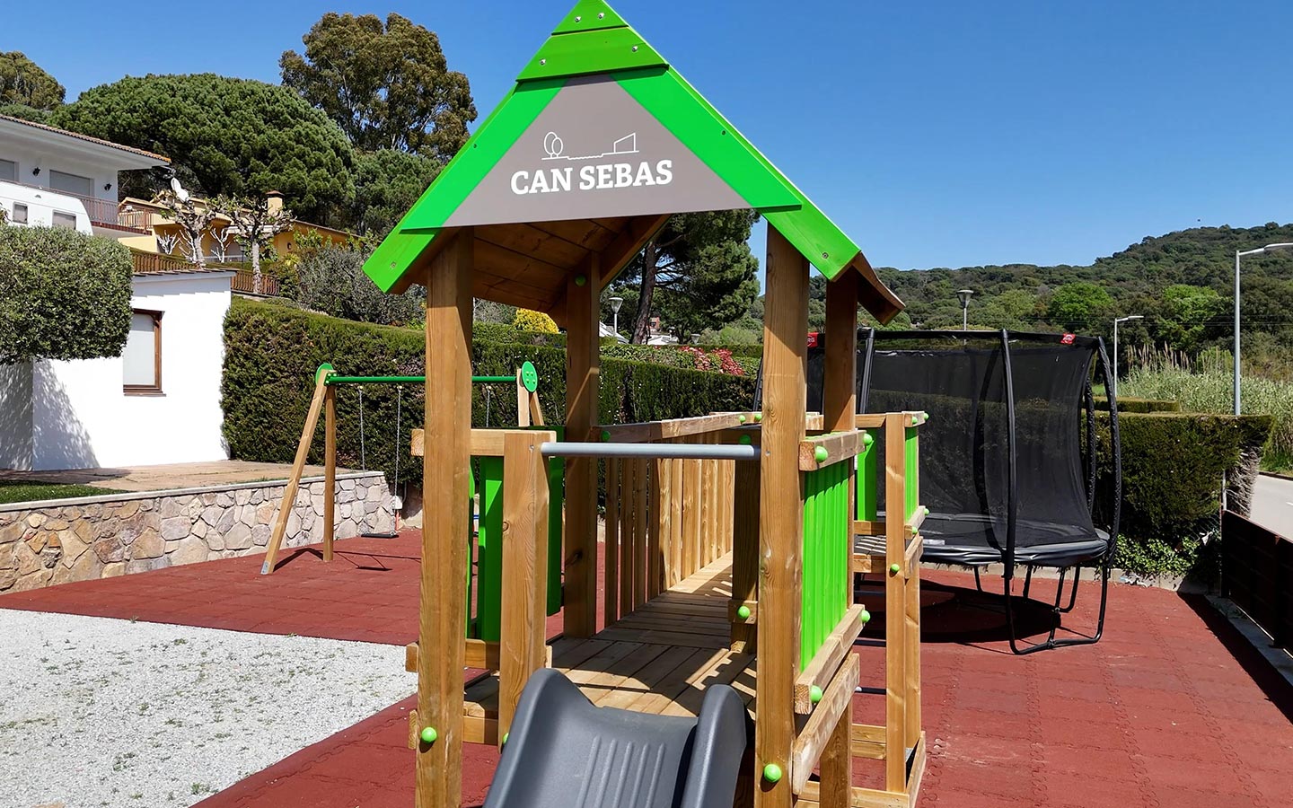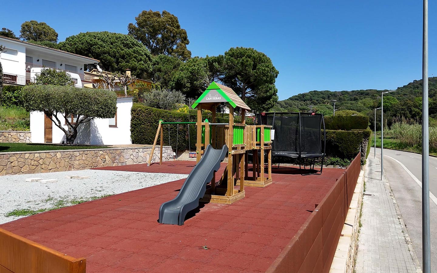 · 8 gandules i 2 para-sols. També podeu fer servir la barbacoa situada sota la pèrgola que inclou dues taules extensibles amb les seves 20 cadires, així com 3 taules suplementàries, 2 bancs, 15 cadires, neveres, forn, microones, Nespresso i dutxa exterior. També disposeu d’un bany privat i un vestidor. La piscina té un manteniment diari i sempre es troba en condicions òptimes per banyar-se. Té una zona molt poc profunda al costat de les escales, ideal per relaxar-se en dies calorosos. El parc infantil està format per dous gronxadors, un llit elàstic, i una torre infantil amb teulada de fusta que incorpora un tobogà i un rocòdrom.
